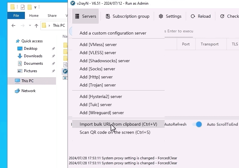 سپس کد اشتراک خود را کپی کنید و از منو "Servers" گزینه "Import bulk URL from clipboard" را انتخاب کنید تا کانفیگ (کد اشتراک) به برنامه اضافه شود.